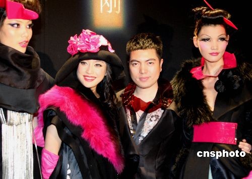 3月28日晚,以“寵愛”為主題的中國國際時裝周SEC2008秋冬高級成衣發(fā)布會在北京精彩登場,給觀眾帶來一場震撼的視覺盛宴。圖為演員秦嵐(左二)與設(shè)計(jì)師祁剛(左三)亮相發(fā)布會。中新社發(fā) 趙雋 攝