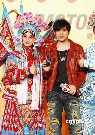 周杰倫在某代言活動現(xiàn)場吊嗓學京劇