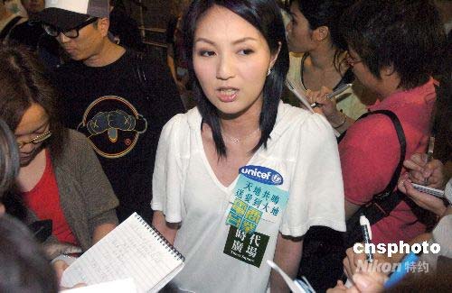五月十六日晚,香港商業(yè)電臺在銅鑼灣時(shí)代廣場舉辦“天地共鳴送愛到大地”籌款活動,呼吁市民踴躍捐款,賑濟(jì)四川地震災(zāi)區(qū)。圖為香港歌星楊千嬅出席。中新社發(fā) 鄧慶樂 攝