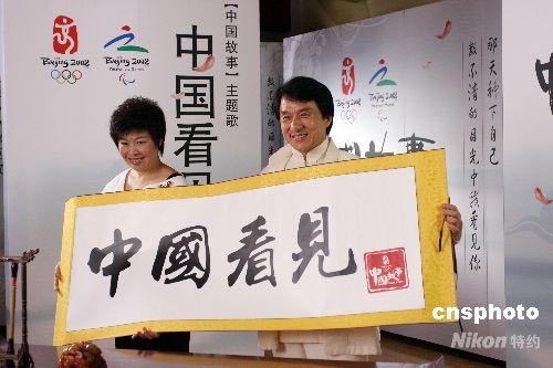 2008年7月8日,北京,2008奧林匹克公園中心區(qū)文化展示活動“中國故事”的主題歌《中國看見》正式發(fā)布。此歌由國際巨星成龍與著名歌唱家譚晶攜手演唱。成龍和于丹共同書寫了“中國故事”主題歌《中國看見》的卷軸。中新社發(fā) 博芽影像 攝