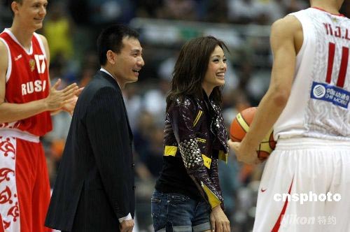 備戰(zhàn)北京奧運會的中國男籃,7月20日晚在杭州舉行的2008斯坦科維奇洲際杯籃球賽的最后一場比賽中以72比50戰(zhàn)勝由年輕選手組成的俄羅斯隊。香港歌星容祖兒作為本屆杯賽的形象大使到場主持開球儀式。中新社發(fā) 任晨鳴 攝