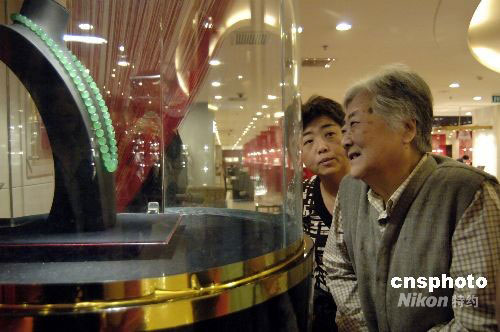 “十一黃金周”臨近,一款估價為1.2億元的天價翡翠項鏈亮相某珠寶商城,為節(jié)日市場先期預熱,由57顆顏色濃綠、質地細膩的“老坑玻璃種”翡翠珠子串成的翡翠項鏈,懸賞總價值10萬元的翡翠飾品作為獎品向全球征名,以期弘揚中華傳統(tǒng)玉文化。中新社發(fā) 徐曦弋 攝