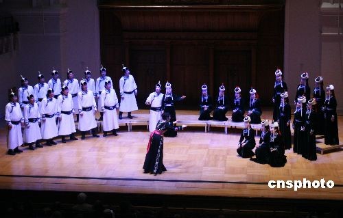 圖為蒙古族音樂家婭倫·格日勒在指揮合唱團(tuán)演唱蒙古族民歌。