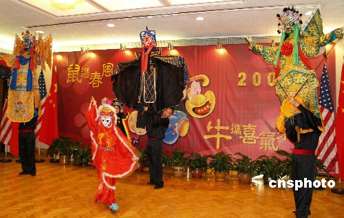 1月16日,中國駐洛杉磯總領(lǐng)館舉行“2009華僑華人新春招待會”,中領(lǐng)館多功能大廳大紅燈籠高高掛,充滿濃濃的過年味?傤I(lǐng)事張云率全體領(lǐng)事與600多位華人華僑代表歡聚一堂,共慶牛年的到來。中新社發(fā) 盧威 攝
