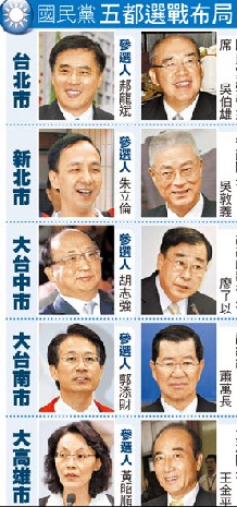 據(jù)了解,黨中央規(guī)劃的陣容,大高雄市由王金平出任,臺(tái)北市由吳伯雄擔(dān)任,新北市交給吳敦義負(fù)責(zé),大臺(tái)中市是由曾任臺(tái)中縣長的廖了以擔(dān)綱,大臺(tái)南市則由出身嘉義市的蕭萬長出馬。
