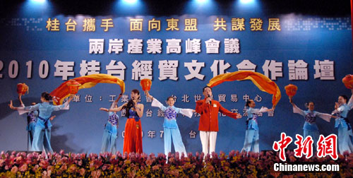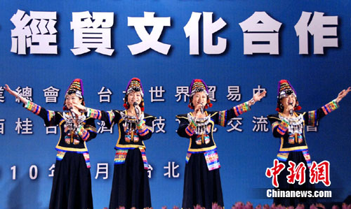 中新網(wǎng)臺(tái)北7月4日電(廖祖平)中共廣西壯族自治區(qū)委員會(huì)書記郭聲琨率領(lǐng)1000余人的廣西經(jīng)貿(mào)文化代表團(tuán)7月1日—7月5日在臺(tái)灣參訪,這是海峽兩岸經(jīng)濟(jì)合作框架協(xié)議(ECFA)簽署后大陸第一個(gè)赴臺(tái)的經(jīng)貿(mào)文化代表團(tuán)?图胰司劬拥膹V西賀州市也由市委書記彭曉春率賀州代表團(tuán)隨廣西團(tuán)一起赴臺(tái)。7月3日下午,由桂臺(tái)(賀州)客家文化旅游合作示范區(qū)與臺(tái)灣世界客屬總會(huì)、廣西同鄉(xiāng)會(huì)聯(lián)合主辦的桂臺(tái)(賀州)客家文化旅游經(jīng)貿(mào)合作懇談會(huì)在臺(tái)北舉行。