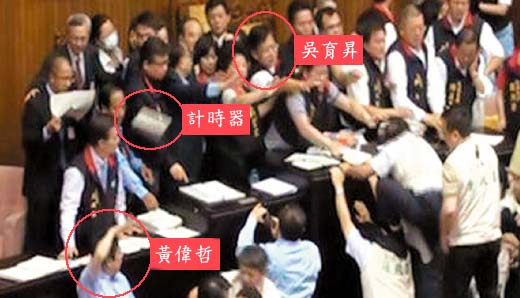 國(guó)民黨昨晚檢視錄像帶,原來(lái)是黃偉哲以“勾射”方式,冷不防向國(guó)民黨“立委”群集處拋出定時(shí)器,不偏不倚砸中吳育升頭部。