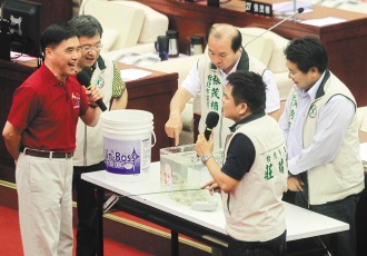 中新網(wǎng)7月15日電 據(jù)臺灣《聯(lián)合報》報道,德國章魚哥“保羅”預言世界杯賽事神準讓其全球暴紅,臺北市長郝龍斌昨天至市議會進行施政報告,民進黨市議員莊瑞雄等人,在議場端出2只臺版章魚哥,預測年底臺北市長選情,郝、蘇誰能勝出。