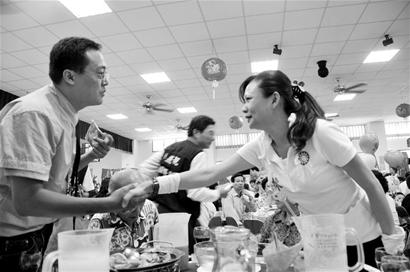 給記者記憶深刻的是,一直在我們身邊默默坐著的一對盛裝夫婦,他們?nèi)胱缶湍,吃了兩三樣菜后,突然聽到司儀說:“請郭添財(cái)?shù)娜!蔽疑磉叺钠炫叟繋е⑿,款款走上舞臺,拿起話筒開始說著洋洋灑灑的祝福語,然后話鋒一轉(zhuǎn):請給專業(yè)、認(rèn)真、負(fù)責(zé)的郭添財(cái)博士一個(gè)機(jī)會,給我們支持,好不好!我這才反應(yīng)過來,身邊這對夫婦竟然是大臺南市長候選人郭添財(cái)?shù)娜缛。郭家三嫂講完后,回到我們這一圓桌,舉杯和我們喝了口酒,然后從包里拿出郭添財(cái)?shù)拿纸o同桌的人,名片上包括郭添財(cái)?shù)膫(gè)人照片、從政簡介、競選口號和各種聯(lián)絡(luò)方式。分完名片,說完拜托的話,他們就站起來說:“我們要先走了,還要去趕下一場!