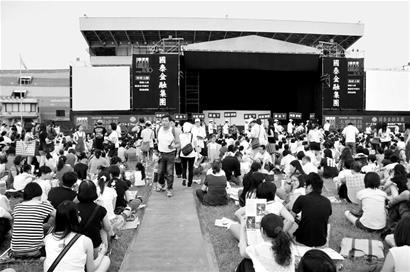 記者找了個(gè)空位,鋪上報(bào)紙坐下來,一問,原來有人16:00左右就來了,F(xiàn)場(chǎng)早到的觀眾,多是朋友結(jié)伴或是一家子。有意思的是,每個(gè)“小隊(duì)伍”都是大包小包裝備整齊:坐墊、便當(dāng)、零食、飲料一應(yīng)俱全。那時(shí)候,正是用餐時(shí)間,大家就坐在地上吃起各自帶來的便當(dāng),感覺像個(gè)大型野餐會(huì)。