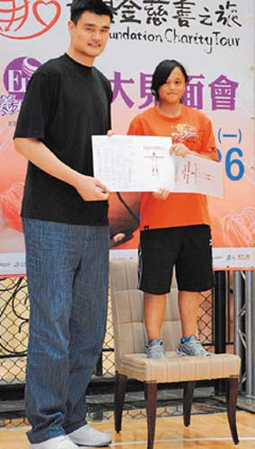 “哇!好高,真的是巨人!”身高只到姚明腰部的桃源中學(xué)一年級(jí)女學(xué)生杜儷馨,代表上臺(tái)致贈(zèng)卡片時(shí),特地搬了張椅子墊高,畫(huà)面很有趣。