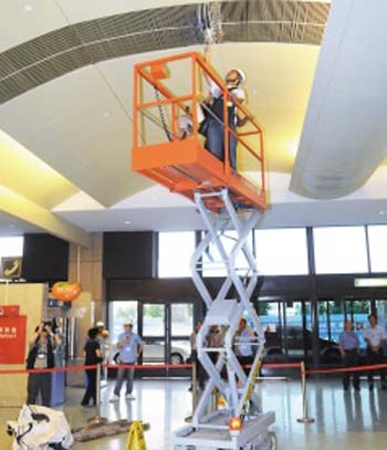 臺(tái)灣民航部門接到通報(bào),要挖土機(jī)立即停工,調(diào)來(lái)升降車升高到屋頂,拆卸部分鋼柵欄,取出更多更大的混凝土碎塊。另外機(jī)電廠商人員也爬上天花板會(huì)勘,發(fā)現(xiàn)天花板上方的空調(diào)及消防管路遭到破壞,并出現(xiàn)漏水情形。