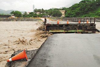 昨天上午10時許,六龜鄉(xiāng)六龜大橋旁的便橋因支撐不住暴漲荖濃溪水沖刷,中間一截應聲斷裂,工務段緊急管制封閉;新開部落聯(lián)外的新寶橋旁便橋也同樣遭荖濃溪水沖毀,百余戶新開部落居民無法外出,臺軍士兵昨天一度冒雨搶通便道。