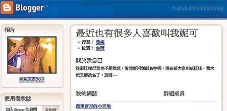 昨天更有出現(xiàn)冒稱應(yīng)召女“妮可”的部落格《薇琪寶貝的小天地》,發(fā)文時間緊扣《壹周刊》報道陳致中召妓疑云的時間點,如7月3日指“接了個名人客人”、22日“被《壹周刊》拍”等。