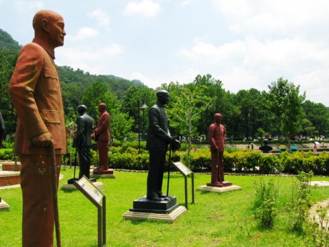 教授告訴我,這個(gè)雕像群落多達(dá)兩百余座蔣介石雕像,因上世紀(jì)90年代后期“去蔣化”運(yùn)動(dòng),各地矗立的銅像紛紛拆除,面臨回爐煉銅的命運(yùn)。慈湖所在的桃園縣當(dāng)時(shí)正值“藍(lán)營(yíng)”執(zhí)政,于是將各地拆除的銅像收來(lái),選出其中藝術(shù)水準(zhǔn)較高者,建成雕塑群。