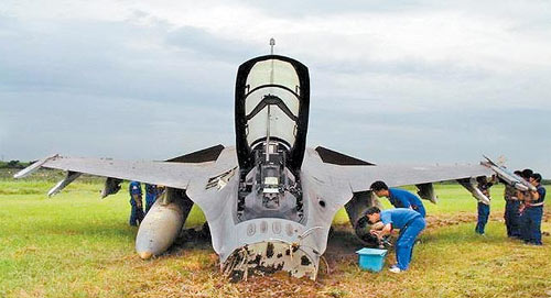 當年6月26日機號6812的F-16B型雙座機,由嘉義聯(lián)隊莊姓分隊長駕駛,后座載著“國防部”整評室副主任陳姓少將,進行戰(zhàn)術攔截課目的熟飛,降落時,未注意跑道積水,致使戰(zhàn)機落地時,飛行員施放阻力傘后戰(zhàn)機嚴重右偏,雖然隨即拋棄阻力傘,立即使用方向舵及煞車改正偏右狀況仍無效,戰(zhàn)機降落跑道上行進約一公里后沖向草坪,機身嚴重受損;經(jīng)評估修復戰(zhàn)機,不包括發(fā)動機的修復即要花800多萬元新臺幣。