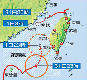 臺灣氣象局特別提醒,臺灣南部山區(qū)及東南部可能有大暴雨,其他地區(qū)可有大雨或暴雨;西南部沿海、鵝鑾鼻、小琉球及澎湖附近海面已出現(xiàn)長浪,請民眾避免到海邊活動。另外,1日上午起,臺灣西南部、東南部沿?諘绲貐^(qū)及澎湖將有較強(qiáng)陣風(fēng)。