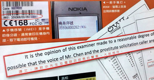 《壹周刊》在訴訟數(shù)據(jù)中發(fā)現(xiàn),陳致中和“召妓男”使用同一支手機,之前陳致中強調他的手機是0958開頭,召妓男使用的是0953,但《壹周刊》指出,訴訟資料中發(fā)現(xiàn)門號雖然不同,但手機序號相同,也就是陳致中和“召妓男”曾用同一支手機打電話。