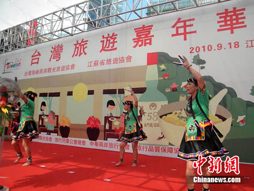 中新網(wǎng)南京9月18日電 (記者 王國安)臺(tái)灣少數(shù)民族的激情歌舞,拉開了臺(tái)灣海峽兩岸觀光旅游協(xié)會(huì)18日在南京舉行的戶外嘉年華活動(dòng)序幕,以此方式向江蘇民眾“面對(duì)面”推介臺(tái)灣游。