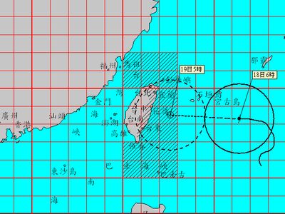 臺風(fēng)“凡那比”17日清晨距離花蓮東方約490公里,以每小時15公里轉(zhuǎn)18公里速度,向西行進,7級風(fēng)暴風(fēng)半徑200公里,近中心最大風(fēng)速每秒43 米。
