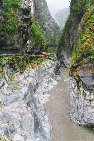 按行程安排,我們當(dāng)晚就要馬不停蹄地趕往100公里外的宜蘭縣。到宜蘭縣已是晚上9點(diǎn)多,下榻的酒店就在路邊。沿途有不少都是溫泉酒店,大部分建在路邊,規(guī)模不大,都是私人經(jīng)營,但很干凈。次日早餐后,我們冒雨乘車駛上橫貫臺灣南北的中橫公路。當(dāng)天主要是游覽臺灣著名景點(diǎn)———花蓮縣的太魯閣大峽谷。
