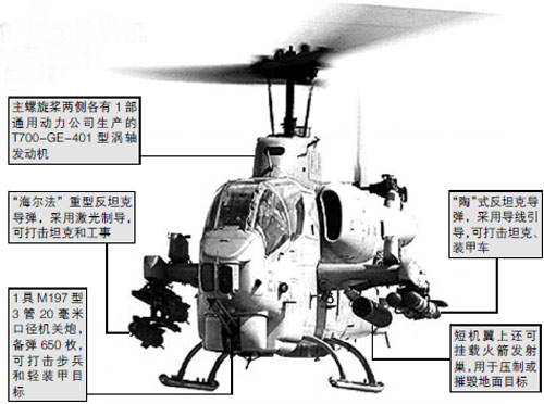 AH-1W武裝直升機機長約18米,高4米,最大起飛重量近6700公斤,采用串列座艙設(shè)計,由2名機組成員操控,裝備有機關(guān)炮、火箭彈、空空導彈和反坦克導彈,是目前臺軍直升機部隊中攻擊力最強的機型。(何西)