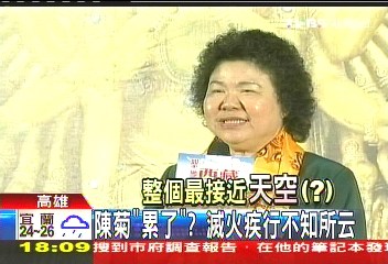 報(bào)道稱,盡管被批得滿頭包,陳菊還是照跑行程,29日下午和高雄縣長(zhǎng)楊秋興同臺(tái)時(shí),不但顯露疲態(tài),還有點(diǎn)語(yǔ)無(wú)倫次。道歉、勘災(zāi)、還得跑行程,陳菊只能用焦頭爛額來(lái)形容。