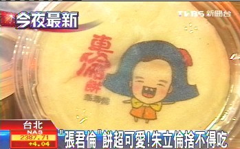 中新網(wǎng)10月9日電 據(jù)臺(tái)灣TVBS報(bào)道,臺(tái)灣“五都”選戰(zhàn)倒數(shù),朱立倫陣營(yíng)推出限量首賣的“車倫餅”,民眾瘋狂搶購!朱立倫變身可愛造型的“乖乖倫”和“OPEN倫”等10幾種創(chuàng)意造型!朱立倫笑說,他最喜歡“張君倫”小妹妹造型,因?yàn)楹芟袼畠,很可愛,他真舍不得把餅吃掉?