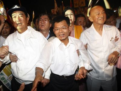 據(jù)報(bào)道,楊秋興17日上午成立競(jìng)選總部,晚間在競(jìng)選總部舉行晚會(huì)。宋楚瑜與前高雄縣長(zhǎng)、“總統(tǒng)府”資政林淵源,在楊秋興夫婦陪同下,從臺(tái)下人群中被簇?fù)砩吓_(tái)。