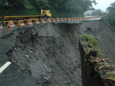 遭遇豪雨的蘇花公路遇雨則坍,南方澳到東澳間多處坍方。臺灣“災(zāi)害應(yīng)變中心”表示,一輛弘泰旅游公司載運大陸觀光客的游覽車在東澳受困,疑被落石擊中,大陸導游及司機困在變形車體內(nèi),深夜確定2人死亡,其他旅客無恙;另傳有一輛創(chuàng)意旅游公司的游覽車,搭載廣東團共19人失聯(lián)。