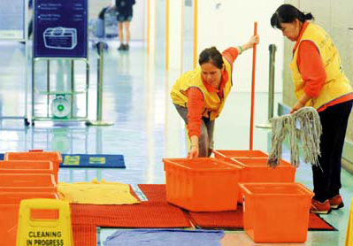 為了避免影響觀瞻,桃園航空站原本規(guī)定室內(nèi)漏水不得用水桶承接,只能用地毯或毛巾放在地上吸水,飽和后再擰到水桶搬走?墒亲蛱斓穆┧刻,地毯及毛巾已經(jīng)無法應(yīng)付,清潔人員還是被迫搬來十多個水桶接水。