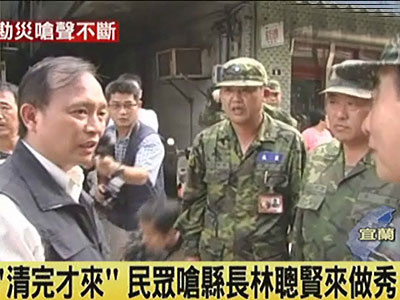 昨天天氣短暫放晴,宜蘭縣長林聰賢巡視淹水災(zāi)區(qū),卻出現(xiàn)不尋常的現(xiàn)象,幾乎走到哪就被罵到哪,一名民眾說,都淹了好幾天了,還是靠著臺(tái)北的女兒上網(wǎng)把淹水的情況公布給大家知道,縣長這個(gè)時(shí)候才到。也有老婦人說,淹水的時(shí)候看不到縣政府的人員前來,還不是靠著自己的力量清理家園,都快清得差不多了,縣長才出現(xiàn)。