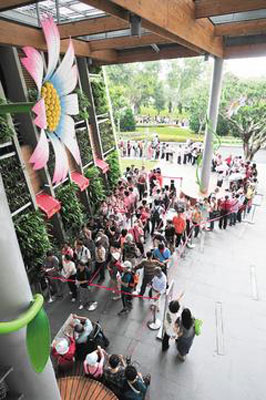 另外,針對夢想館、養(yǎng)生館、真相館、名人館、故事館等5個展館,花博總部采發(fā)放預(yù)約券入館,從早上9點開始一次發(fā)放,發(fā)完為止;其中最熱門的夢想館,每日發(fā)放四千張預(yù)約券,25日上午到11時左右則發(fā)了兩千多張,并未如預(yù)期“暢銷”;而之前同樣熱門的“夢想劇場”,因不發(fā)放預(yù)約券,采用現(xiàn)場排隊,場外則是大排長龍。