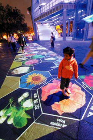 投影光雕有五個(gè)互動(dòng)設(shè)計(jì),測試階段只展演“花語寄情”,一踩在投影花苞上,玫瑰、向日葵、茶花、梅花等花卉就會(huì)瞬間盛開,還會(huì)出現(xiàn)花卉信息,朵朵投影互動(dòng)花海,恰與一旁地景花!罢婊ā毙纬捎腥Ρ。