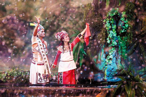 《百合戀》由屏風(fēng)表演班及少數(shù)民族舞者制作、主演,劇情融合魯凱族親情、愛情,以及人與土地之情,水舞臺有潺潺水瀑,透過9座600公斤油壓臺及像“烤肉架”的鐵網(wǎng)設(shè)計,可瞬間切換涌出水來,變成一池寬10米、深9米的湖水,搭配漫天泡沫及魯凱語歌聲回蕩,仿佛置身山谷間。