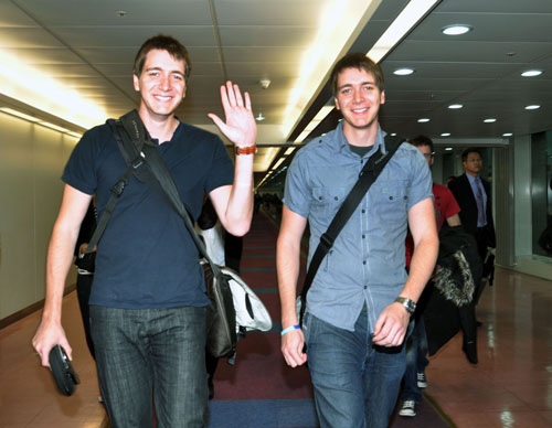 《哈利波特》系列電影《哈利波特:死神的圣物》先前在倫敦首映掀熱潮,電影19日將在臺灣上映。片中榮恩的雙胞胎哥哥“弗雷”與“喬治”本人詹姆斯與奧立佛菲爾普斯(James & Oliver Phelps),在發(fā)行片商華納兄弟牽線下,15日上午搭機抵臺,為新片宣傳。