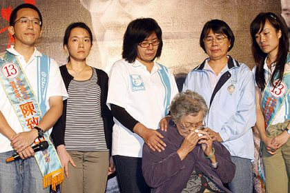無獨(dú)有偶,“招妓”話題如影隨行的扁子陳致中,在其競選總部門口舉辦“來不及說再見,陳水扁坐監(jiān)惜別晚會(huì)”,為自己的選舉拉抬聲勢。晚會(huì)組織者露出口風(fēng):不排除讓扁媽當(dāng)眾下跪。雖然最終扁媽沒有下跪催票,但扁家人哭成一團(tuán)的場景仍就是綠營的一大妙招。