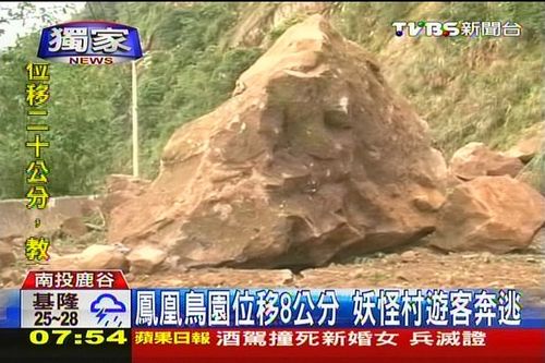 往鹿谷里面走,投56線也出現(xiàn)坍方,巨石滾下來,在路面上砸出1條長長的裂痕,田底村13戶住戶,還有30多名采茶工人,還受困在村內(nèi),等待救援;觀光景點(diǎn)鳳凰谷鳥園,也因?yàn)榈嘏7恚a(chǎn)生位移、樓梯下陷,地面高低落差將近8公分,園方也宣布暫時封園