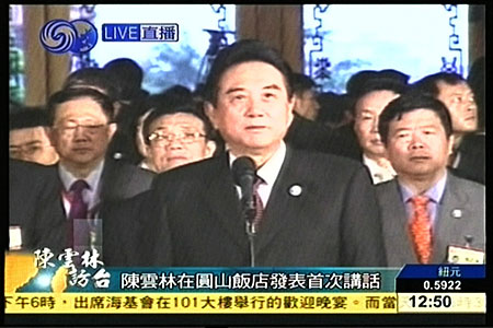首先讓我代表代表團(tuán)的全體成員,向江董事長及其海基會各位朋友以及在這里迎候我們的各位朋友、各位鄉(xiāng)親表示衷心地感謝,同時(shí)也請?jiān)试S我轉(zhuǎn)達(dá)大陸十三億人民向海峽彼岸2300萬我們的骨肉同胞,表示真誠地祝福和真心地感謝。