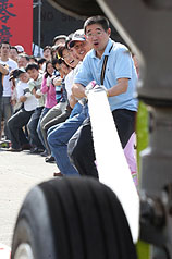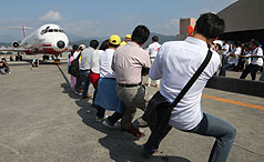 員工組則顯得有備而來,穿著整齊制服,當(dāng)30十名選手還拉不動(dòng)時(shí),遠(yuǎn)航董事長樂大信和總經(jīng)理陳尚群也加入拔河,直到40人終于拖動(dòng)飛機(jī),多位選手大呼好玩。