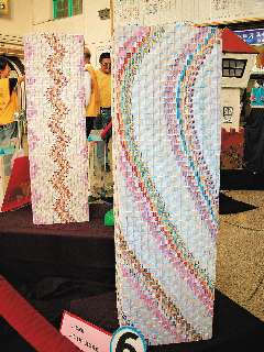 臺南高商廣告設(shè)計商、當(dāng)?shù)亟處焺t與學(xué)生共同創(chuàng)作,提供五項作品參展,分為鳳凰花和安平古堡等造型。府城舊冊店家潘靜竹則以“愛心久久”為題,將發(fā)票箱點綴成美麗少女。