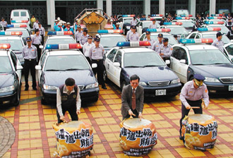 中新網(wǎng)11月28日電 據(jù)臺灣《聯(lián)合報(bào)》報(bào)道,為了宣示查賄的決心,屏東縣調(diào)查站主任、屏東“地檢署”檢察長、屏東縣警察局副局長27日在縣立棒球場前擊打?qū)懹小扮娯赋龀,賄選難逃”的大鼓,宣示“鐘馗抓賄車隊(duì)”啟動(dòng)。 (陳昆福 攝)