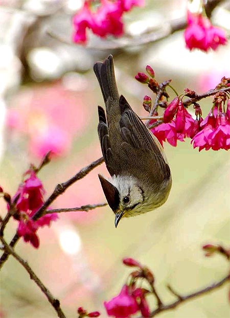 南投掠影:畫(huà)眉在櫻花間覓食 好似一幅年畫(huà)(圖)