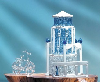 據(jù)臺灣《聯(lián)合報》報道,許源榮以玻璃棒加手工拉絲編織技法,慢慢編出旅游中心。色彩一樣是藍白,完成了這座迷你版旅游中心,有一種樸拙美。