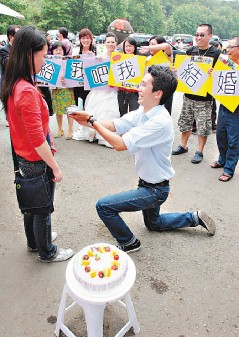 據(jù)臺灣《聯(lián)合報(bào)》報(bào)道,60對新人昨天齊聚蔣介石銅像園區(qū)參加“穿越時(shí)空遇到愛”集體結(jié)婚典禮。新人們牽手步過鵲橋進(jìn)入會(huì)場,個(gè)個(gè)拼創(chuàng)意,有舉牌助婚團(tuán),還有頂著爆炸頭的新郎倌,連穿自由車車裝新人都搶著亮相,讓園區(qū)里頭喜氣洋洋。