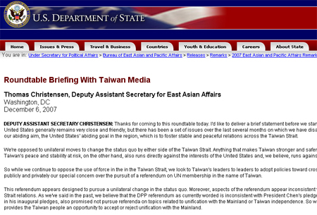 柯慶生首先發(fā)表一份聲明說,美國曾私下和公開表明反對(duì)“以臺(tái)灣為名義加入聯(lián)合國的公投”,因?yàn)槊婪秸J(rèn)為這代表追求單方面改變現(xiàn)狀,違反陳水扁初次就職演說的承諾,包括不更改“國號(hào)”和不會(huì)推動(dòng)“統(tǒng)獨(dú)公投”。