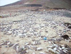 春節(jié)以來的嚴重寒害,造成澎湖望安島鴛鴦窟海灘魚尸遍野,整座沙灘全是死魚,師生悲痛稱之“哭泣的沙灘”。(臺灣中國時報圖;洪嬡慧提供)