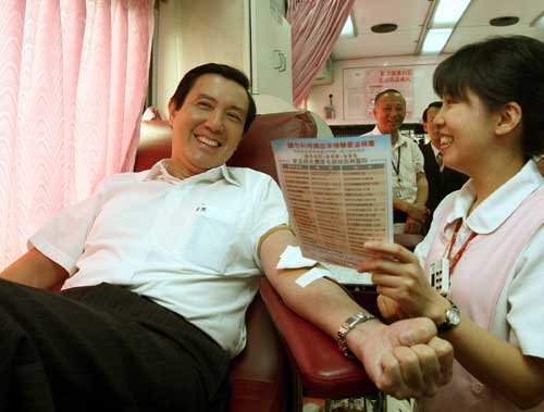 報(bào)道說(shuō),經(jīng)常捐血的馬英九今天捐出兩袋血,共五百c.c.,捐完血并愉快地向記者說(shuō)捐血很快樂(lè),并和捐血車工作人員合影留念。馬英九累積已捐出一百七十八袋血。