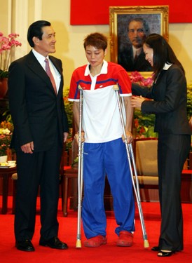 馬英九接見中華臺北奧運代表團(tuán),與受傷的跆拳道選手蘇麗文(中)合影。(“中央社”圖)