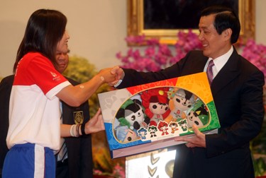 中華臺北奧運代表團(tuán)掌旗官賴圣蓉(左)贈送奧運福娃給馬英九。(“中央社”圖)